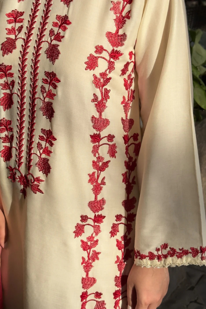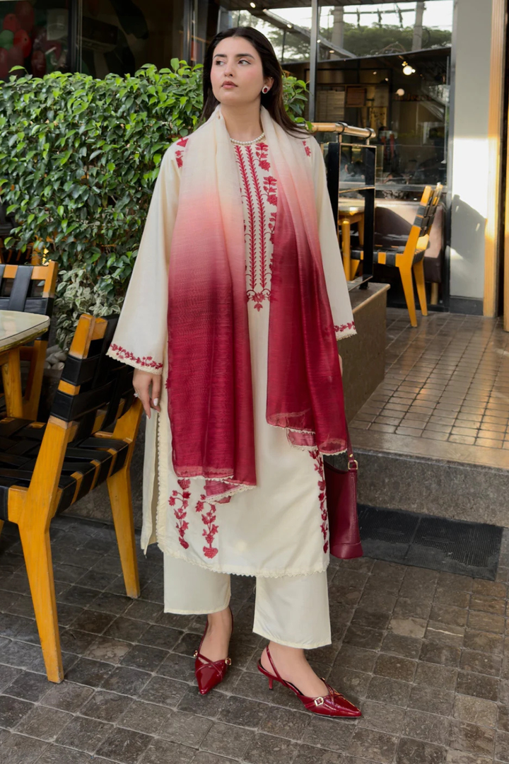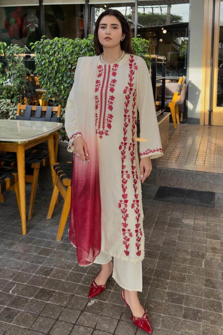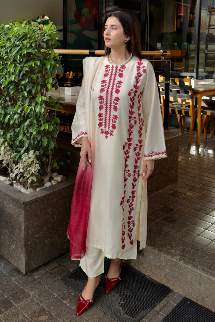 Chameli 3-Piece — a cream stone-linen outfit featuring full embroidery, matching trouser detailing, and an elegant organza dupatta with a refined red tone. A soft, versatile look suitable for casual to semi-formal wear.