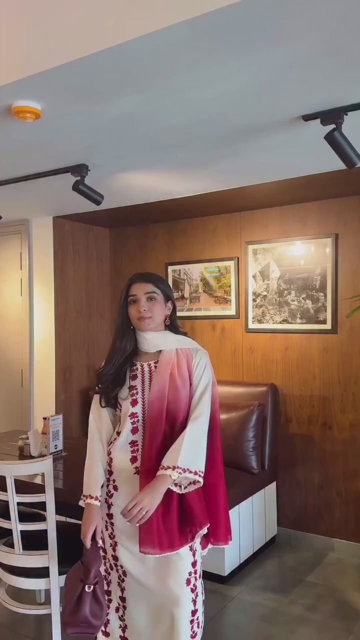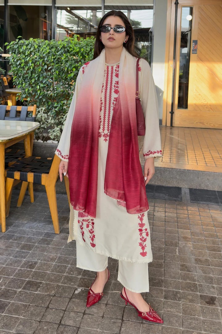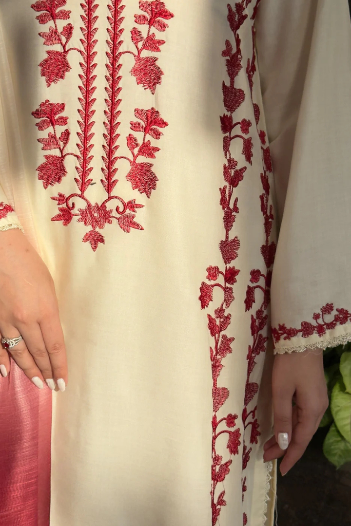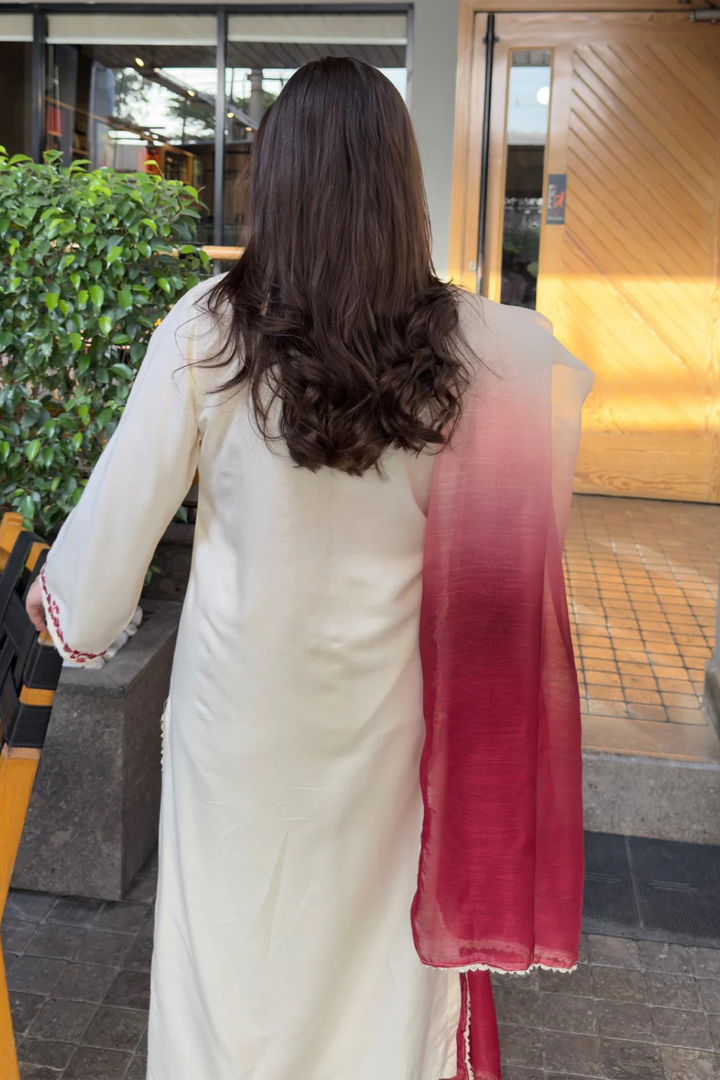 Chameli 3-Piece — a cream stone-linen outfit featuring full embroidery, matching trouser detailing, and an elegant organza dupatta with a refined red tone. A soft, versatile look suitable for casual to semi-formal wear.