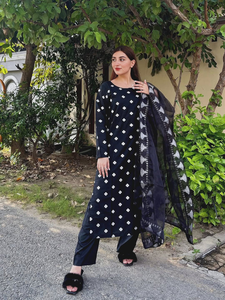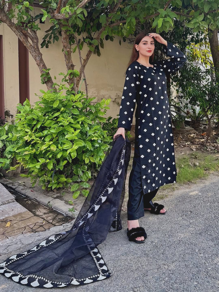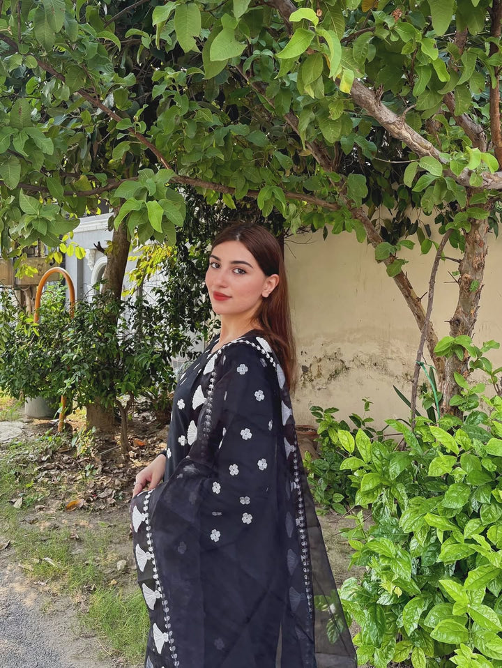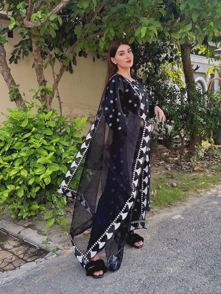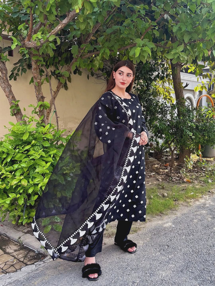 A black stone linen outfit with intricate embroidery, paired with a plain trouser and an organza cutwork dupatta – a perfect blend of elegance and sophistication for festive evenings and semi-formal gatherings.