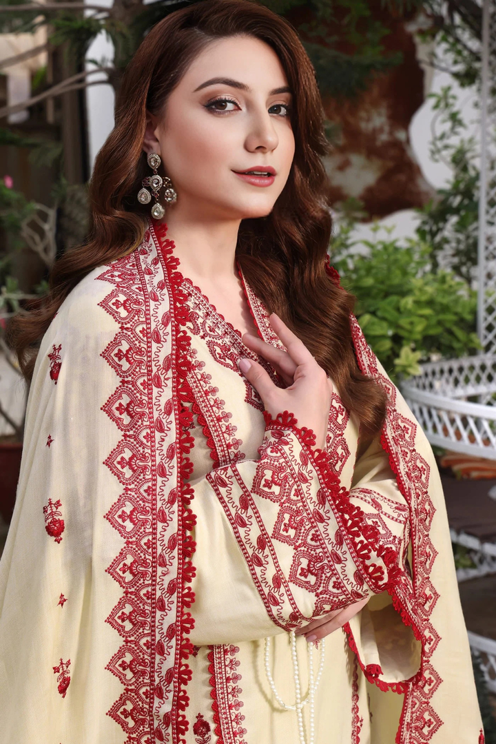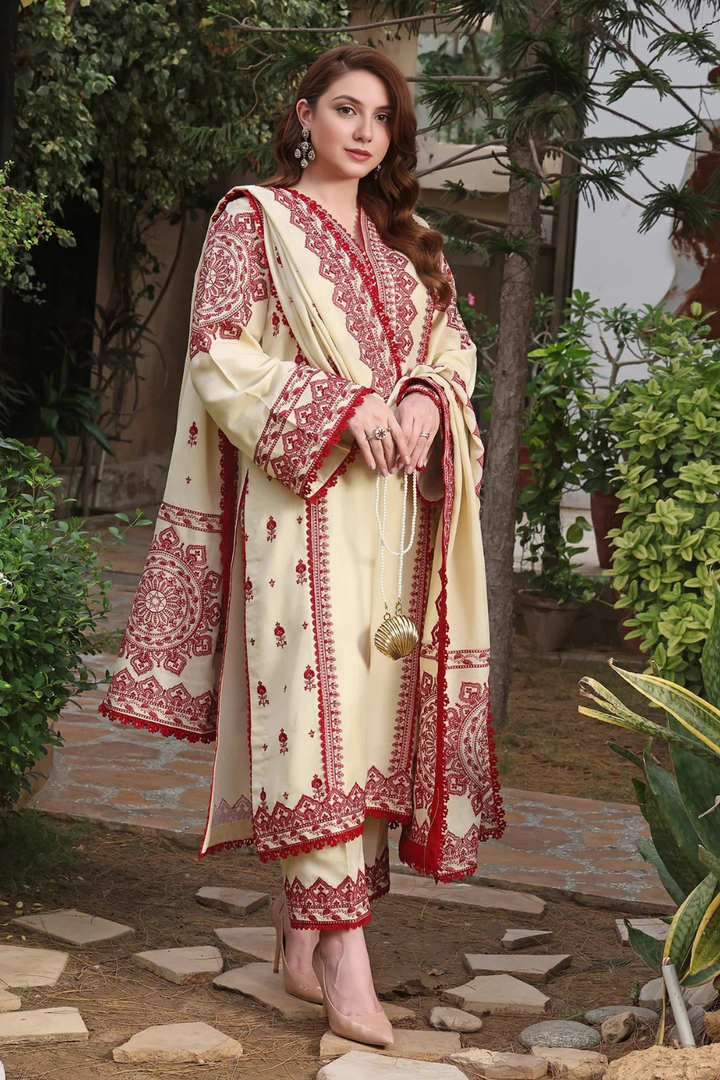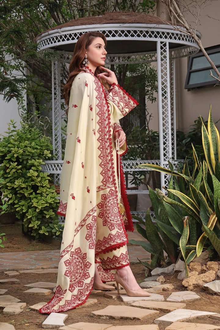 A cream stone linen 3PC gracefully adorned with deep maroon embroidery, exuding timeless elegance and regal charm for winter festivities.