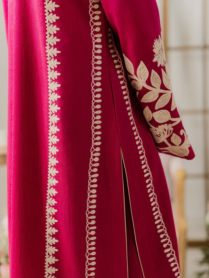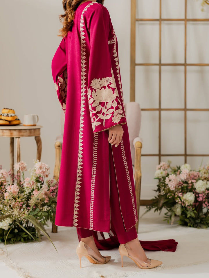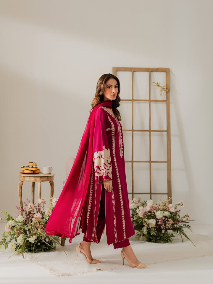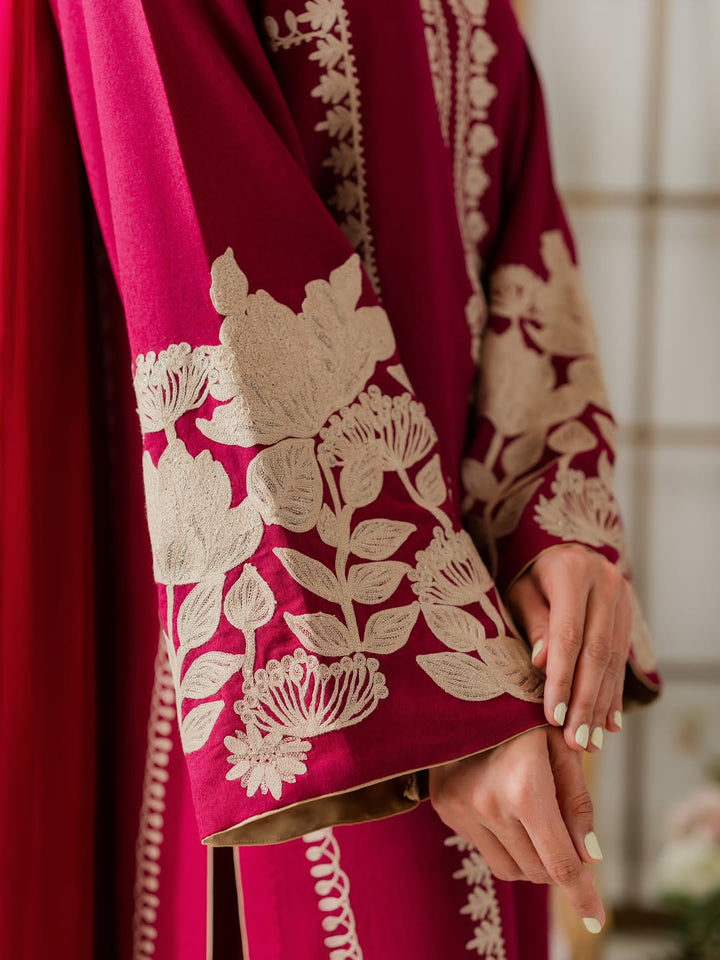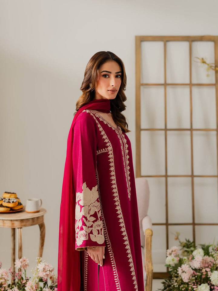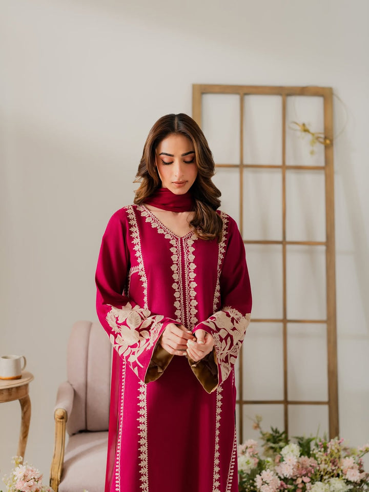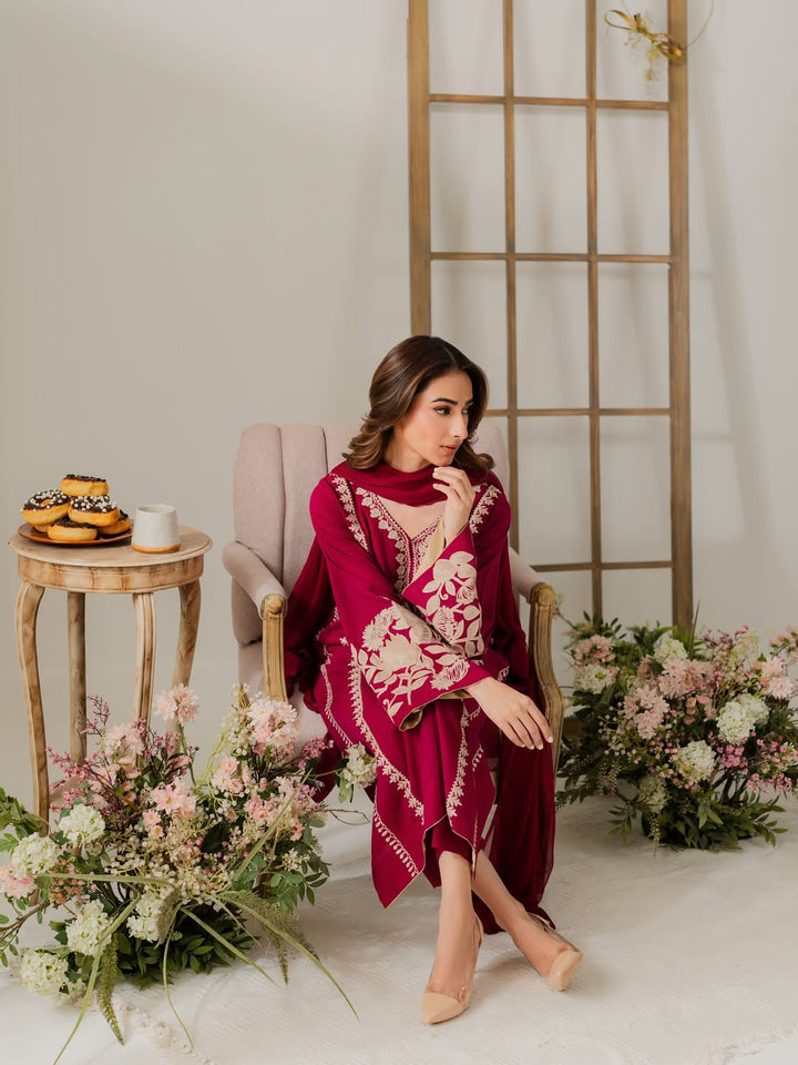 Elevate your winter charm with LAALI, a deep magenta 3PC in premium stone linen, delicately embroidered in beige and paired with a graceful chiffon dupatta. ✨