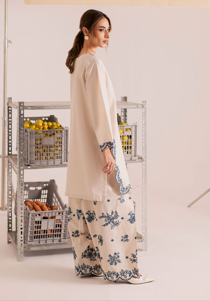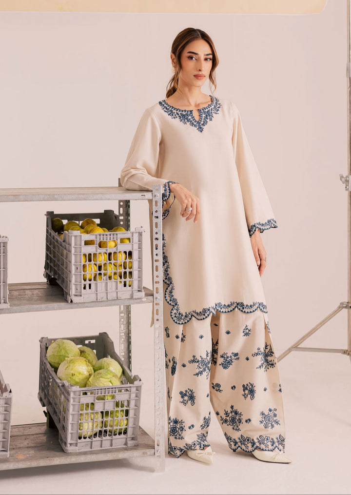 An ivory khaddar 2-piece beautifully embroidered with soft blue threadwork. Featuring a short shirt and farshi shalwar, this elegant outfit blends winter warmth with timeless charm.