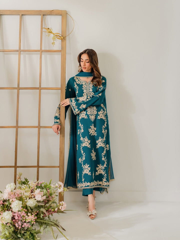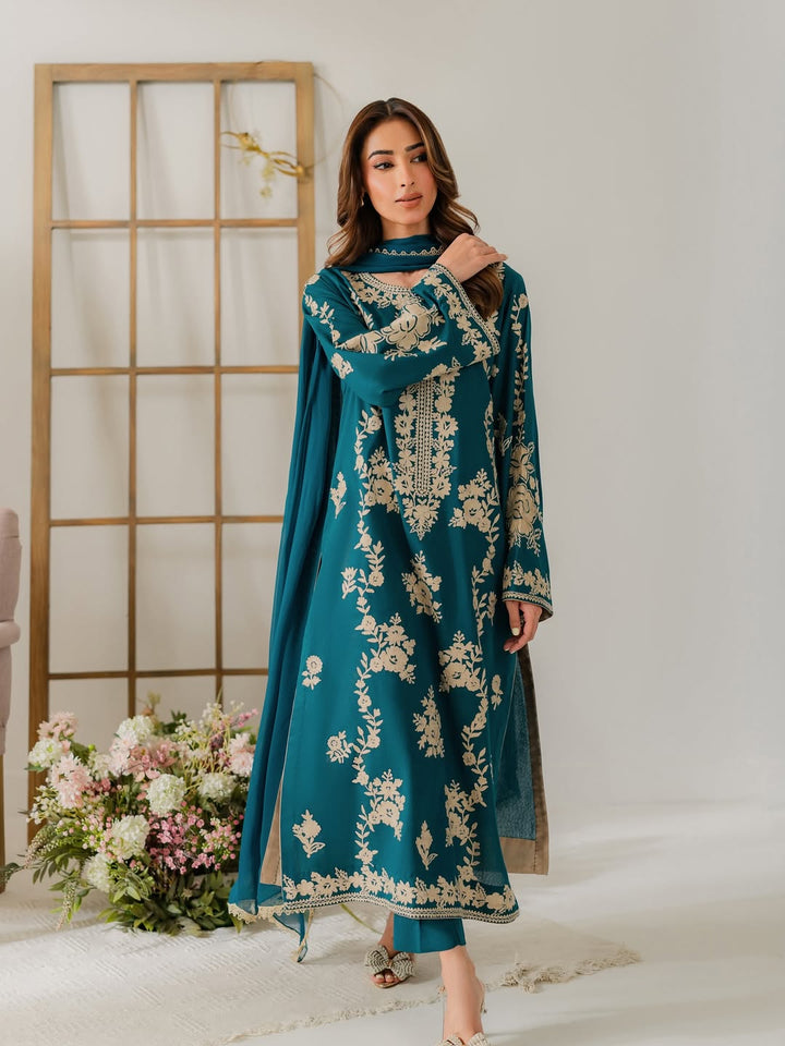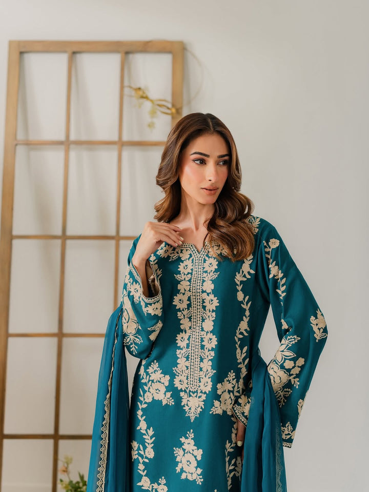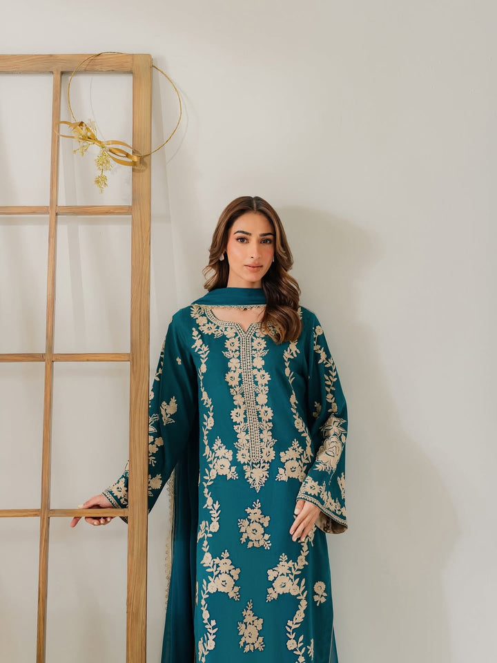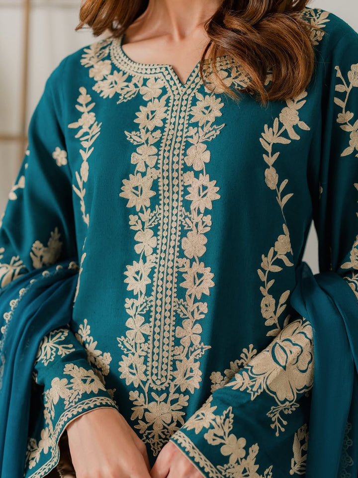 Elevate your winter elegance with MEENAH, a teal-blue stone linen 3PC adorned with beige Aari embroidery. Paired with a plain trouser and chiffon dupatta, it’s a perfect fusion of tradition and modern grace. 💫