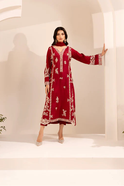 Enhance your winter elegance with RUDABA, a red stone linen 3PC beautifully adorned with beige Aari embroidery, paired with a plain trouser and chiffon dupatta for a refined, graceful look. ✨