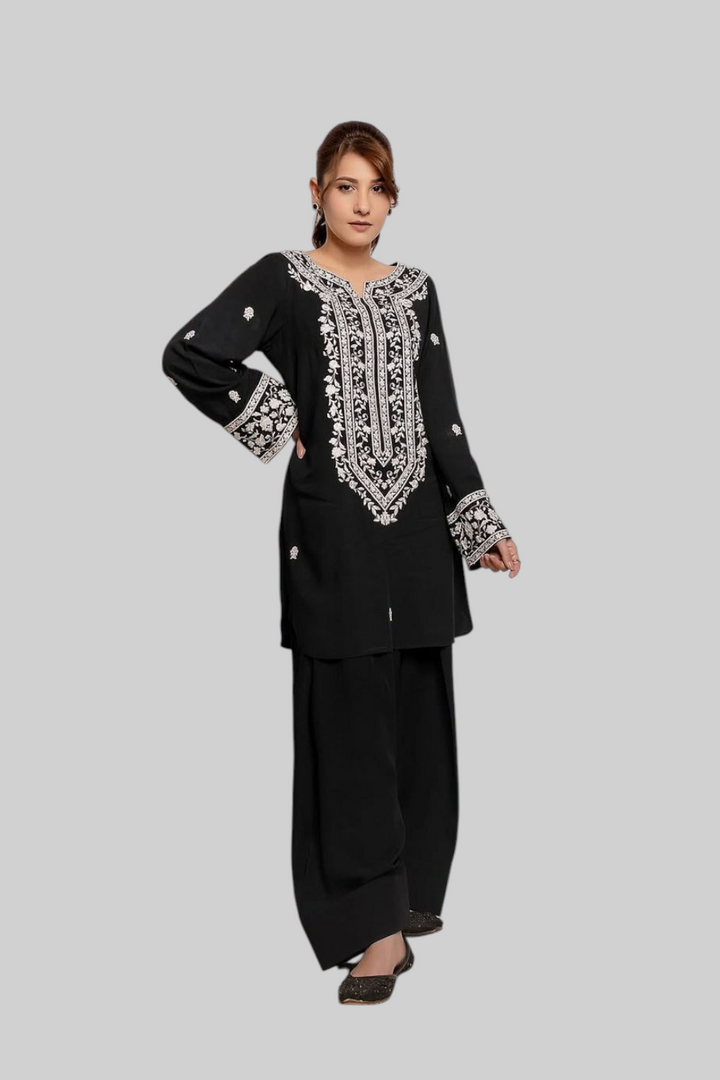 Elevate your style with our black Chambray Linen 2-piece set, featuring intricate multicolor thread embroidery enhanced with delicate lace detailing. The perfect blend of comfort and sophistication for any occasion.